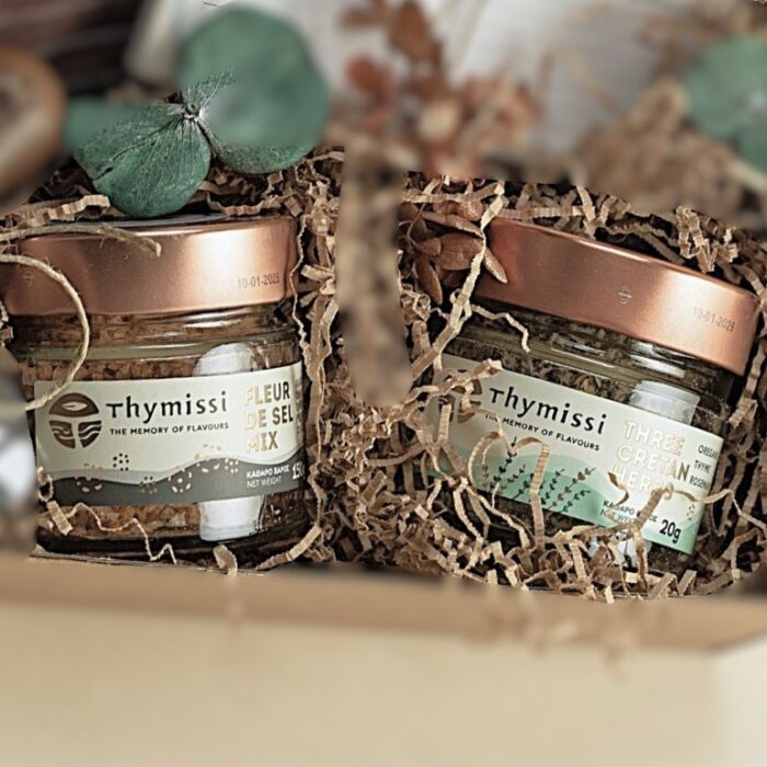 • Ανθός θαλασσινού αλατιού Fleur de Seul mix της Thymissi. Συλλέγεται με το χέρι από φυσικές αλυκές στη νότια Κρήτη, εμπλουτισμένος με σκόρδο, κρεμμύδι, γλυκιά πάπρικα και τσίλι. Το Fleur de Seul mix της Thymissi είναι ένα 100% φυσικό προϊόν που χαρίζει νοστιμιά σε κάθε πιάτο.