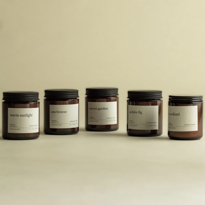 Όλα τα κεριά μας συσκευάζονται σε γυάλινο βάζο amber με μεταλλικό μαύρο καπάκι. Είναι φτιαγμένα από εμάς με φυτικό κερί σόγιας και ξύλινο φιτίλι και αρώματα χωρίς parabens και φθαλικές ουσίες απόλυτα ασφαλή για την οικογένεια και τα κατοικίδια, βιώσιμα και φιλικά προς το περιβάλλον.